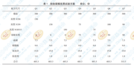 實驗以橡膠標準配方作為依據,通過對比 N330、N339、裂解炭黑及其混合配方混煉膠的膠 料拉伸強度、扯斷伸長率、100%定伸應力、300% 定伸應力和DIN磨耗數據,分析裂解炭黑對橡膠性 能的影響,同時通過對配方中炭黑及裂解炭黑份 量的變化研究其性能變化趨勢。表1為設計的廢舊 輪胎裂解炭黑及爐法炭黑配方試驗方案。