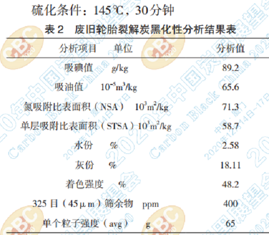 小結:通過以上數據的分析,輪胎裂解炭黑的 吸碘值類似 N339,吸油值類似于 N326,氮吸附比 表面積類似于 N351,但著色強度又類似于軟質炭黑 N660,可能原因是此炭黑中各種粒徑結構的炭 黑、碳酸鈣等大粒徑低結構成份影響,產品中325 目篩余物為鐵磁性物質,應該是有部分細小鋼絲 未被除盡,灰份主要是碳酸鈣、硬酯酸、氧化鋅或 陶土等成份,灰份指標將嚴重影響橡膠的老化性 能。