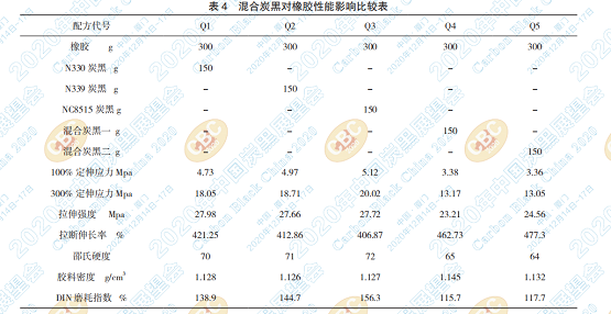 為了研究輪胎裂解炭黑的性能,我們分別采 用50%N339+50%輪胎裂解炭黑進行混合(以下簡 稱混合炭黑一),和50%NC8515+50%輪胎裂解炭 黑進行混合(以下簡稱混合炭黑二),根據炭黑的 加合性能計算混合炭黑的化性數據,同時將混合 炭黑按標準橡膠配方混煉,分析混煉膠性能,再與 N330 炭黑的混煉膠性能進行對比,對比結果如表 2、表 3。