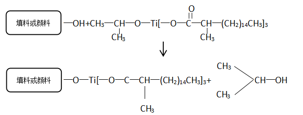 目前常用的偶聯(lián)劑可以分為硅燒、鉻化合物、鈦酸酯和鋁酸脂四大類,其中后兩者較適用于顏料-熱塑性樹脂體系。典型代表為三異硬脂酰基鈦酸異丙酯(TTS),其偶聯(lián)機(jī)理如下:
