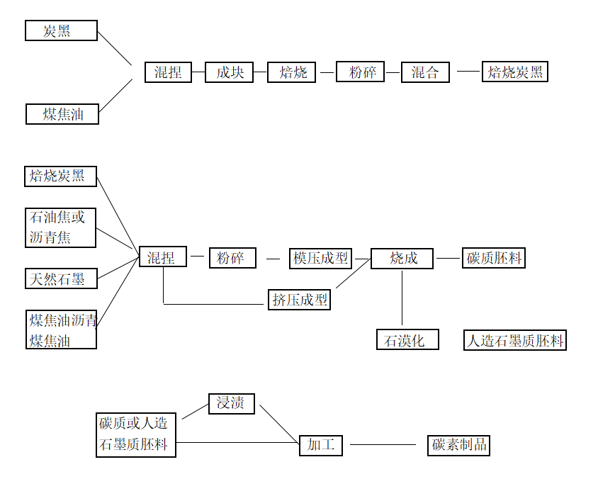 由圖1可以看出,碳素制品可以用多種碳質(zhì)原料,一般情況,炭黑的價(jià)格高于焦炭和天然石墨,因此僅用于不可缺少的用途。