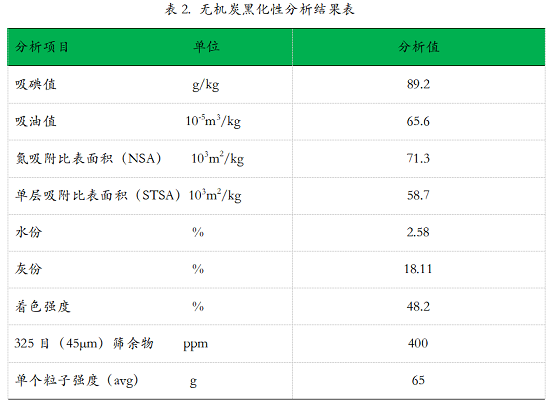 為了了解輪胎裂解炭黑的粒徑及結構,我們按照炭黑的分析方法對表征炭黑性能的幾個指標進行了分析,分析結果如表2.
