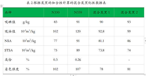 表2.根據炭黑的加合性計算的混合炭黑化性數據表