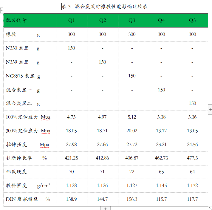 從上表可以看出:混合炭黑的化學性質如吸碘值、吸油值、氮吸附比表面積與N330類似。