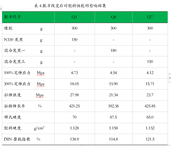 為了改善填充炭黑的膠料物理性能,實驗采用增加N339炭黑的使用量,減少輪胎裂解炭黑的使用量,即改用配方Q6的用量,即其它材料不變,將N339炭黑的用量增加至66.7%,輪胎裂解炭黑的用量減少至33.3%即66.7%的N339+33.3%的輪胎裂解炭黑進行混合(以下簡稱混合炭黑三)。同時用配方Q7進行另一個對比實驗,即其它原材料不變,僅增加混合炭黑一的用量,將混合炭黑一用量增加至180g研究對填充炭黑的膠料性能影響,其結果如表4.