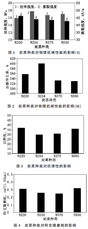 從圖1和圖2可看出,炭黑N234的粒徑小且結(jié)構(gòu)度高,形成的結(jié)合膠的量多,高結(jié)構(gòu)度可使炭黑在橡膠基體中的分散性較好,因此補(bǔ)強(qiáng)效果好,拉伸強(qiáng)度和拉斷伸長(zhǎng)率都最高;炭黑N220的粒徑與炭黑N234的相差不大,但結(jié)構(gòu)度低,其分散性受到影響,因此拉伸強(qiáng)度較低;隨著炭黑粒徑的增大,撕裂強(qiáng)度稍呈降低趨勢(shì)。