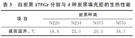 白炭黑175Gr分別與4種炭黑(N220,N234,N375和N550)的填充膠壓縮生熱性能見(jiàn)表3。