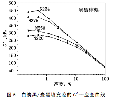 圖5是白炭黑175Gr分別與4種炭黑填充膠的儲(chǔ)能模量(G′)與應(yīng)變之間的關(guān)系曲線。