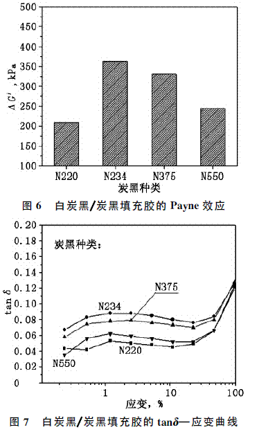 圖6是白炭黑175Gr分別與4種炭黑的填充膠Payne效應(yīng)。Payne效應(yīng)可用來(lái)表征填料的分散性好壞,也可判斷填料之間的相互作用力的大小。從圖6中可看出,白炭黑175Gr/炭黑N234填充膠的Payne效應(yīng)比較明顯,說(shuō)明填充膠中形成的填料網(wǎng)絡(luò)較強(qiáng)。分析后認(rèn)為,這主要是因炭黑N234的粒徑小且結(jié)構(gòu)度高,炭黑與橡膠間形成的包容膠的量增多,使得自由橡膠的量減少的原因。這就相當(dāng)于增加了炭黑的有效體積,減小了填料粒子間的作用距離,使得填料網(wǎng)絡(luò)更易形成,Payne效應(yīng)比較明顯。由于炭黑N220的結(jié)構(gòu)度低,白炭黑175Gr/炭黑N220填充膠的包容膠的量少,Payne效應(yīng)相對(duì)較低,動(dòng)態(tài)損耗因子較低,見(jiàn)圖7。