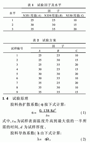 汽車輪胎在行駛過程中,由于橡膠復合材料的粘彈性造成的滯后損失以及與地面之間的摩擦生熱,輪胎溫度會逐漸升高[1]。當輪胎溫度超過臨界溫度時,就有可能發生爆胎現象。因此,輪胎熱量的及時傳遞逐漸成為配方設計中不容忽視的問題,目前國內這方面的研究正處于起步階段。混合物的導熱遵循加和法則[2],因而橡膠的導熱系數因所加填料的種類和用量而異,炭黑作為橡膠工業中最重要的補強填料,其影響不容忽視。N300系列炭黑是子午線輪胎胎面膠中常用炭黑,本工作在子午線輪胎胎面膠配方的基礎上,用正交試驗法研究炭黑N330,N339和N351用量對胎面膠導熱系數的影響。