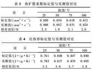 用耐馳公司提供的Pyrex(高溫玻璃)標樣做校核試驗。由于導熱系數由比熱容和熱擴散系數測定值通過分析軟件計算求得,因此只需對比熱容和熱擴散系數進行校核,測試數據如表3和4所示。由表3和4可見,熱擴散系數和比熱容測定的相對誤差都較小,滿足試驗準確性要求。
