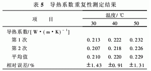 取試樣進行重復性測定,結果見表5。由表5可見,導熱系數測定的相對誤差最大為±1.43%,重復性良好。