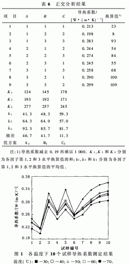 其它溫度下測得的9個試樣導熱系數正交分析優方案均為A3B3C3。可以看出,分析出來的最佳方案在1~9號配方中沒有出現,與其較接近的是9號配方。實際測試結果也可看出,9號配方膠料的導熱系數最高。為了確定方案A3B3C3的可行性,又進行了一次試驗(試樣編號10,炭黑N351,N339和N330用量分別為35,35和20份),得出30,50,60,70和90℃下的導熱系數分別為0.303,0.321,0.325,0.333和0.360W·(m·K)-1。