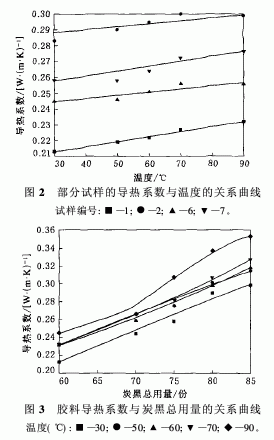 (2)對于同系列炭黑,膠料導熱系數隨炭黑粒徑的增大而增大,并與溫度有較好的線性關系;膠料導熱系數隨炭黑總用量的增大呈上升趨勢。