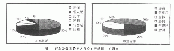 人們對輪胎的基本要求有三。一是具有較高的濕路面的抓著力(抗?jié)窕?或較好的牽引性,以確保車輛行駛及人員的安全;二是滾動阻力小,以節(jié)省燃油并減少廢氣的排放。一般輪胎滾動阻力每降低3%~4%,耗油量可減少1%。基于胎面的滾動阻力約為轎車輪胎的50%,載重輪胎的30%,因此降低胎面的滾動阻力是節(jié)省燃油的重要途徑。轎車及載重輪胎各部位對滾動阻力的影響見圖1;三是耐磨性好,使用壽命長。為了獲得上述性能,白炭黑特別是高分散性白炭黑在胎面膠中的應用是必不可少的。