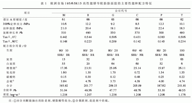 北京橡膠工業(yè)研究設計院曾對國外多種類型和規(guī)格輪胎的胎面膠進行剖析,歐洲市場195/65R15高性能轎車輪胎胎面膠的主要性能和配方特征見表1。從表1中可以看出:胎面膠在60℃時的tanδ與白炭黑的用量相關,即白炭黑的用量越多,60℃時的tanδ越低,也就是滾動阻力越低。目前,白炭黑在轎車輪胎胎面中的用量最多為65份。