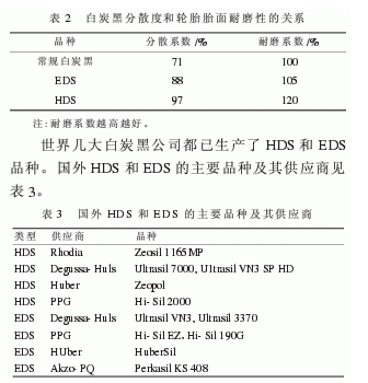 高分散性白炭黑(HDS)是一種具有高分散性且無粉塵的白炭黑產(chǎn)品,適用于“綠色”輪胎。易分散性白炭黑(EDS)是20世紀90年代中期開發(fā)的一種性能介于HDS和常規(guī)白炭黑之間的產(chǎn)品,其價格較HDS低,是一種性價比較好的替代HDS的產(chǎn)品。填充常規(guī)白炭黑的膠料,濕牽引性好,滾動阻力低,但耐磨性很不好。采用HDS或EDS后,由于白炭黑在膠料中分散狀況較好,可以顯著提高輪胎的耐磨性。白炭黑分散度和輪胎胎面耐磨性的關系見表2。