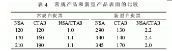 最近德固賽公司又研究開發(fā)了被稱為第三代白炭黑產(chǎn)品的“獨特結(jié)構(gòu)的高分散性白炭黑”,其分散性和補強性更好,該公司在介紹這種白炭黑的文章中,將上文所述的HDS和EDS產(chǎn)品統(tǒng)稱為第二代白炭黑。這種白炭黑的性能特征是:(1)NSA顯著高于CTAB比表面積常規(guī)產(chǎn)品和新型產(chǎn)品表面的比較見表4。