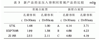 采用壓汞法可以測出這種新產(chǎn)品多孔而可塑,它比常規(guī)白炭黑有多得多的孔隙和大孔容積,導致其NSA與CTAB比表面積有不尋常的比值,并有相當高的結(jié)構(gòu)。新產(chǎn)品的汞壓入容積同常規(guī)產(chǎn)品的比較見表5。表5顯示出新產(chǎn)品同常規(guī)產(chǎn)品的孔隙容積比較,結(jié)構(gòu)越高越容易被橡膠分子滲入,分散就更好。