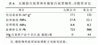據(jù)報道,上海九琛精細化工有限公司研制成功了無凝膠高分散性白炭黑產(chǎn)品,其特征是不含200目水洗篩余物,填充這種產(chǎn)品的硫化膠中不出現(xiàn)白點。該公司用其產(chǎn)品和國內(nèi)某家大公司的產(chǎn)品進行了對比,無凝膠白炭黑和有凝膠白炭黑物性、分散性對比見表6。