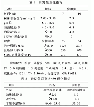 白炭黑、Si-69偶聯劑理化分析結果如表1、表2所示,白炭黑、Si-69偶聯劑的理化指標均達到企業標準要求,總體生產工藝控制水平良好,產品質量比較穩定。