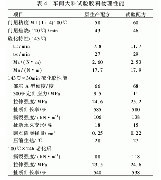 為了進一步考察加入白炭黑和Si-69偶聯劑后的工程輪胎上層膠的膠料物理性能,選擇綜合性能較好的4#配方與原生產配方進行車間大料對比試驗,結果如表4所示。