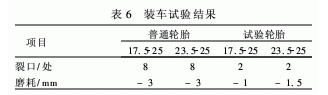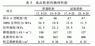 從表5可以看出,成品試驗輪胎的300%定伸應力、拉伸強度、撕裂強度、扯斷伸長率、阿克隆磨耗量較普通輪胎均有提高。