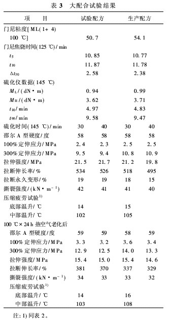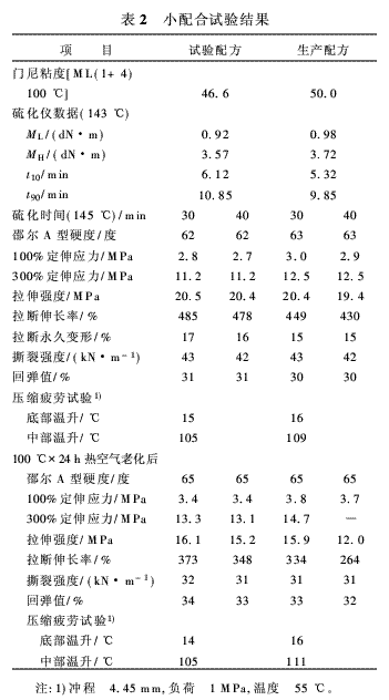 從表3可以看出,試驗配方和生產配方膠料的硫化速度基本一致,焦燒時間大體相同。試驗配方硫化膠老化前后的拉伸強度、拉斷伸長率、撕裂強度和壓縮疲勞溫升略優于生產配方硫化膠,定伸應力略小于生產配方硫化膠。與小配合試驗保持了較好的重現性。