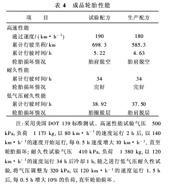 采用試驗配方膠料進行胎肩膠擠出生產,并成型硫化了兩條235/85R16 10PR規格輪胎,分別進行高速性能試驗及耐久和低氣壓耐久性試驗,結果見表4。
