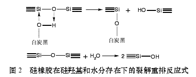 氣相法白炭黑由于表面硅羥基比較多,它們很容易與空氣中的水分形成氫鍵而吸附水分,這些活性硅羥基和吸附水分的存在,在高溫下將使硅橡膠分子鏈產生圖2所示的熱降解重排反應。從反應式中可以知道,硅羥基和水分的存在,不僅使硅橡膠斷鏈,而且還生成了新的硅羥基,這將引起連鎖反應,導致膠料軟化,力學性能和使用壽命下降。此外,白炭黑的水分含量過高,容易造成LSR在熱硫化成型時產生氣泡。