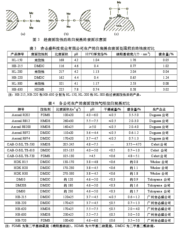 白炭黑經過表面改性后,降低了其表面硅羥基數量,提高了其與有機物的相容性以及分散性。表3是廣州吉必盛科技實業有限公司生產的白炭黑在表面處理前后的性質對比。從中可以看出,氣相法白炭黑經過表面改性后,其表面的活性羥基被有機基團所取代,表面硅羥基密度減小,因此白炭黑的表面極性降低,吸水性下降,其增稠觸變性也下降,分散性提高,而選擇合適的表面改性劑改性后,其pH也將升高。因此,白炭黑經過表面改性后,對LSR的流變性能、力學性能、透明性和使用壽命等都有利。表4是目前市場上各公司生產的可用于LSR的表面改性的氣相法白炭黑產品。
