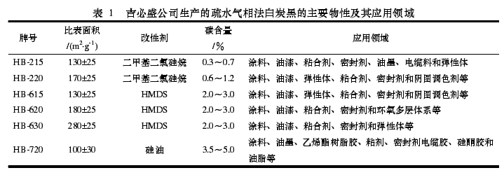 通過碳含量的測定可以定量判斷氣相法白炭黑表面改性效果的好壞。當(dāng)然,利用不同改性劑處理不同比表面積的氣相法白炭黑,其改性后的碳含量是不同的。表1給出了吉必盛公司生產(chǎn)的改性后的氣相法白炭黑(疏水氣相法白炭黑)的主要物性及其應(yīng)用領(lǐng)域。