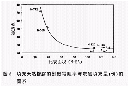 采用先前所述的膠料(見表1),對于N110、N220、N550、N772和A 1、A 2、A 3,分散度與電阻率相關。獲得的結果証實,正如文獻所描述的那樣,滲透點是由炭黑的粒徑決定的。在這種情況下,A X品種的這個值與其比表面積一致。但是在其他的研究中,對高RSA的炭黑觀察到滲透點比預期的要低。這一事實可能歸因于較高的填料 填料相互作用,這樣的作用會導致炭黑在聚合物內形成通道,降低其電阻率水平。不過,如果類似的事情發生在A X品種上,就很難被檢測出來,這可以從圖3中觀察到。在該圖中,這些炭黑的滲透點位于斜率非常小的區域,使得我們難以看出其差異。