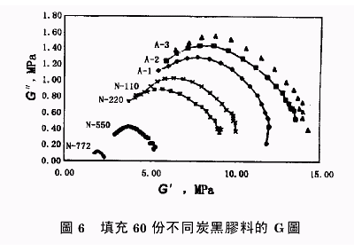 從圖6中可以看出,對于N110、N220、N550、N772,填料的比表面積減小招致G1?和G?值減小。當配方中包含有這些炭黑時,這種現象可能是填料 填料相互作用較強的標志。在其他對填充有高RSA炭黑橡膠膠料的研究中,亦獲得了較高的G和G值。高RSA炭黑的表面活性能通過IGC(這種技術可以檢測出高極性的成分來測定。應該指出的是,在初步的研究中對A1也發現了高特殊極性成分。但是,不僅該參數在這,兩種填料(高RSA和高無定形碳含量)之間是常見的,而且它們背離Maurer相關性也表明了不同于常規炭黑的行為。