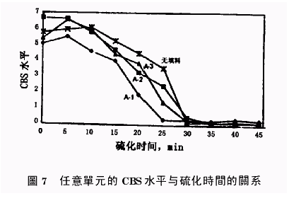 采用早先研究中摸索出的一種方法來評估硫化動力學,在該方法中遵循模型膠料硫化法(MCV),用角鯊烯作為天然橡膠的模型。圖7表明了促進劑的分解,從而讓位給2 2? 二硫代二苯并 唑(MBTS)這樣的硫化中間體,即MBTP具有的結構跟先前的膠料相同,但是硫塬子數增加了(P=1,2,3……)。由于能觀察到A 1具有較高的活化成分,填料表面(認為在此發生了分解)的高度吸附可以解釋其較低的密度。這些結果還表明:早先形成的MBTS和硫化介質內的游離硫含量較低,歸因于其在角鯊烯鏈中摻混更快。對RSA高的炭黑品種也發現其分解更快。