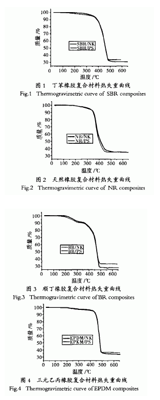 從表4可知,納米高嶺土(NK)比白炭黑(PS)填充的橡膠復合材料相比,前者耐熱溫度普遍提高了,熱穩(wěn)定性能較好.SBR/NK與SBR/PS相比,開始失重溫度提高了126.75 oC,失重5%、10%、30%、50%的溫度分別提高了9.71、2.28、0.93、0.96℃ ,而顯著失重和穩(wěn)定失重時的溫度分別提高了3.5℃和55 oC.NR/NK與NR/PS相比,開始失重溫度提高了11.74℃ ,失重5% 、10% 、30% 、50%的溫度分別提高了4.19、2.88、3.91、1 1.84℃,而顯著失重和穩(wěn)定失重時的溫度分別提高了10 oC和8O℃.BR/NK與BR/PS相比,開始失重溫度提高了85.46℃,失重5% 、10% 、30%的溫度分別提高了l7.82、2O.54、3+2O ,失重50%的溫度下降了0.62℃,兩者基本相當,而顯著,大重和穩(wěn)定,火重時的溫度分別提高了1 cc和9O .EPDM/NK與EPDM/PS相比,開始失重溫度提高了3.51 oC,失重5%、10% 、30%的溫度分別提高了6.78、1.29、0.29 ,尖重50%的溫度下降了O.60℃,兩者也基本相當,而顯著失重和穩(wěn)定失重時的溫度分別提高了1.2 和50.