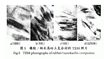 從圖5可知,高嶺石片狀顆粒 4種橡膠復合材料中絕大多數(shù)呈現(xiàn)次級結(jié)構(gòu)的片狀定向 行排列,片層厚度均小于100 nm,長度在300 nm左右.高嶺石的次級結(jié)構(gòu)片層已被橡膠分子有效的隔離開來,并且與橡膠基質(zhì)界面之間結(jié)合緊密,沒有明顯的孑L隙,這表明改性后的高嶺石片層在橡膠中分散良好,形成了二維高嶺石橡膠納米復合材料.高嶺石片層的定向平行排列,對提高復合材料的拉伸性能、耐熱性能起到了至關(guān)重要的促進作用.