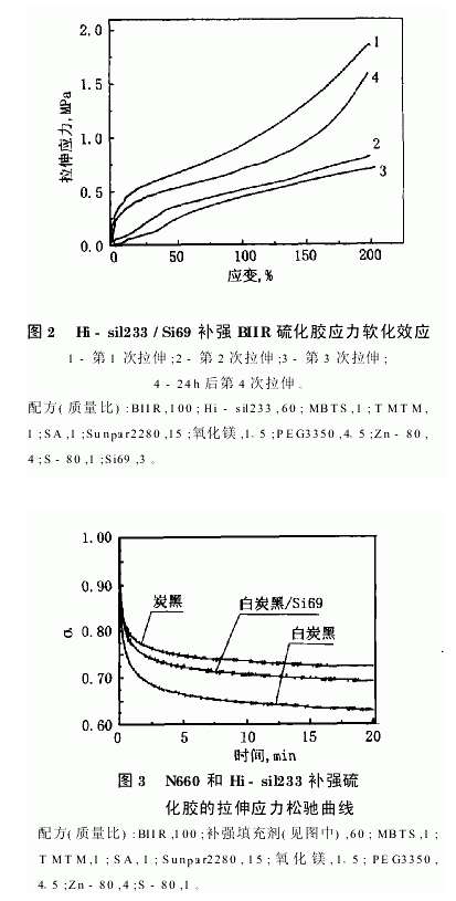(2)Si69的加入,增強了Hi-sil233補強BI IR硫化膠的應力軟化效應,明顯降低了BIIR硫化膠的應力松馳速度和程度,說明Si69可以增強白炭黑與橡膠之間的相互作用,改善Hi-sil233補強BIIR硫化膠的性能。