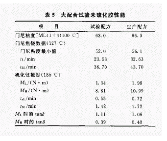 從表5可以看出,與生產(chǎn)配方膠料相比,試驗 配方膠料的門尼粘度略低,焦燒時間較短,硫化速 度較快,混煉工藝性能較好,滾動阻力略小。