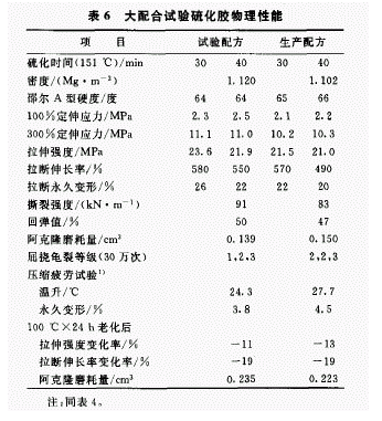 根據(jù)小配合試驗結(jié)果,同時綜合膠料的工藝性能和成本,確定采用試驗配方B進行大配合試驗。為提高硫化膠的拉伸強度和進一步改善抗撕裂性能,大配合試驗時對試驗配方B的生膠體系進行了調(diào)整。增大了NR/BR并用比。大配合試驗結(jié)果見表5和6。