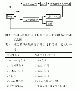 氣相二氧化硅新工藝的出現,改變了氣相二氧化硅工業的發展模式,使得氣相二氧化硅工業和有機硅單體工業之間的關系更加密切,它解決了有機硅單體工業副產物的處理問題,在氣相二氧化硅生產過程中的副產物(鹽酸)可返回有機硅單體合成車間,用于單體的合成,而生產的氣相白炭黑產品則大部分用于有機硅產品的后加工,這樣形成了資源的循環利用。因此,氣相二氧化硅生產企業大多選擇在大型有機硅單體公司附近設廠,二者密切合作,相互促進發展。圖1是氣相二氧化硅工業和有機硅工業資源循環利用示意圖,圖1是相互密切關聯的有機硅公司和氣相二氧化硅公司,它們都是相互在附近設廠,相互促進發展,取得了極好的社會經濟效益。