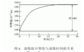 氣相二氧化硅對HTV硅橡膠加工性能的影響一般是以結構化程度(ΔCrepe)表示,ΔCrepe是用混煉膠在室溫下存放28d后的可塑度(p28)和混煉完成后立即測定的可塑度(P0)之差(見圖3)來表示的,膠料的可塑度與氣相白炭黑的用量、表面性質和結構性有關。產生結構化的原因是由于氣相二氧化硅的表面硅羥基與硅橡膠中的氧原子形成氫鍵以及二氧化硅表面吸附著硅橡膠分子鏈,導致膠料隨著時間的延長,其流動性下降,膠料變硬,影響加工性能。因此,在加工過程中需要加入結構化控制劑或者選擇表面經過處理的氣相白炭黑[7-13],結構化控制劑的加入以及氣相二氧化硅的表面處理,都是通過結構化控制劑或表面處理劑與二氧化硅表面的硅羥基反應,從而減少表面羥基的數量,使與硅橡膠形成氫鍵的數量減少,混煉膠的混煉時間縮短,可塑度增大,起到降低結構化效應,提高加工性能和儲存穩定性的目的。