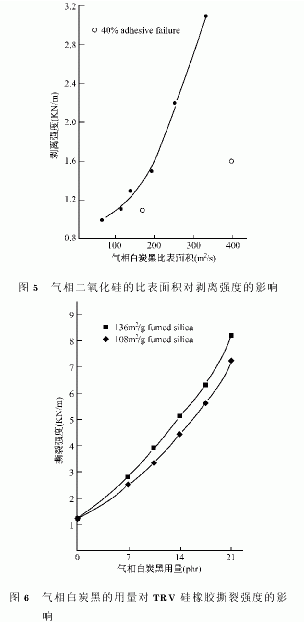 氣相白炭黑是RTV硅橡膠非常有效的補強填料,可以顯著提高其強度。一方面,是由于氣相二氧化硅粒子的小尺寸效應和大的比表面積;另一方面是因為其表面含有很多硅羥基,粒子可以通過氫鍵和范德華力的作用形成網絡結構,同時二氧化硅粒子還會與聚硅氧烷分子產生強烈的相互作用,改善了界面狀況。圖4是氣相白炭黑用量對RTV硅橡膠拉伸強度和邵爾A硬度的影響(氣相二氧化硅的比表面積為153m2/g),圖5是氣相二氧化硅的比表面積對RTV硅橡膠剝離強度的影響,圖6是氣相白炭黑的用量對RTV硅橡膠的撕裂強度的影響。