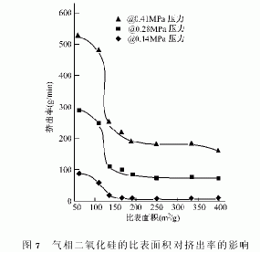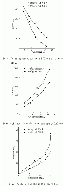 在RTV硅橡膠中添加氣相白炭黑時,必須關注其在聚合物中的分散程度。圖10是氣相白炭黑用量對混煉時間的影響。從圖中可以看出,隨著氣相白炭黑的用量和比表面積的增大,混煉時間延長。