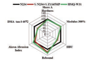 推薦HMQ-W31應用于半鋼胎胎面中,有效降低滯后性能的同時可保持補強性和磨耗性能。
