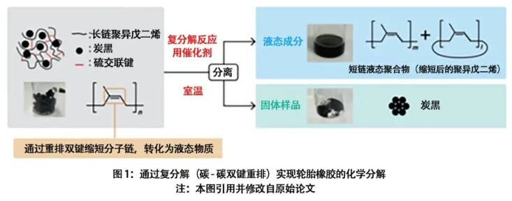 一直以来,天然胶cȝ聚异戊二烯可借助催化复分解反应实C捷分解,但废旧轮胎中的硫化聚异戊二烯胶却因成分会抑制复分解反应,成ؓ回收领域的一大难题。ؓ此,研究团队突破口攑֜胎橡胶匹配适宜的催化剂与溶剂上Q以此实C联结构聚异戊二烯在温和的q常温条件下的化学分解。从工艺原理来看Q分子间复分解反应会让聚异戊二烯分子间的? - _键重排,不过生成的分子链长度不均Q难以直接获取短分子?而分子内复分解反应则会催生环状聚异戊二烯Q进而实现分子链的羃短?/p>
