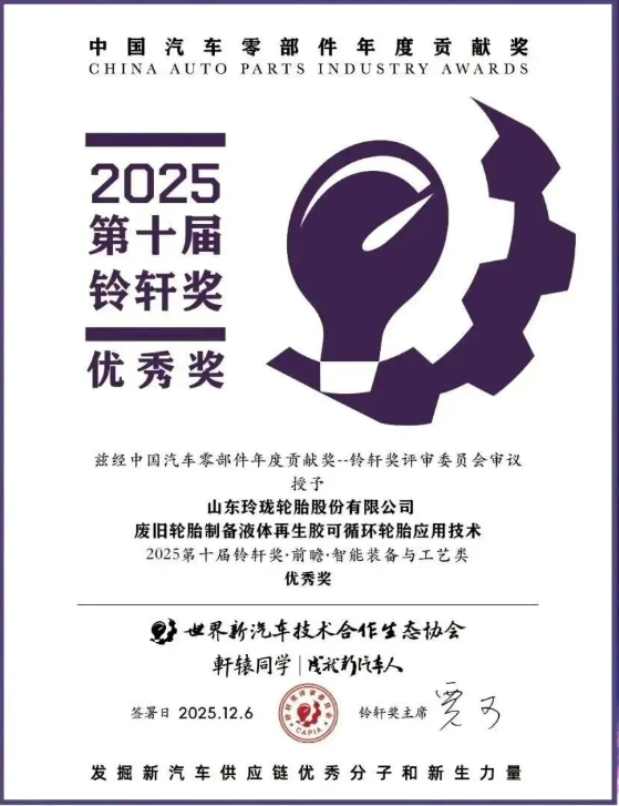 伴随全球汽R产业l色转型潮的到来,玲珑轮胎凭借前L技术ؓ中国轮胎行业交出了专属解x案。此ơ获奖的 “废旧轮胎制备液体再生胶可@环轮胎应用技术”,_և瞄准废旧轮胎q一全球性环保难题。该技术可在低温温和的环境中,依靠q箋化、自动化的精密系l,废旧轮胎高效{化ؓ高性能液态再生胶。相较于传统高温裂解工艺Q这一创新不仅大幅降低了生产阶D늚能耗,q从源头规避了二ơ污染问题,实现了全程清洁化生产。其产出的液态再生胶具备分子量分布均匀、相Ҏ优异、流动性佳{诸多优势,成功废旧轮胎这一 “黑色污染? 转化为高附加值绿色原料,搭徏起从废弃物到高值化利用的完整闭环,胎行业打造了l济效益与环境效益兼儡优质范本Q引领业@环经朝着高端化、低_方向q进?/p>