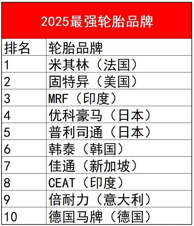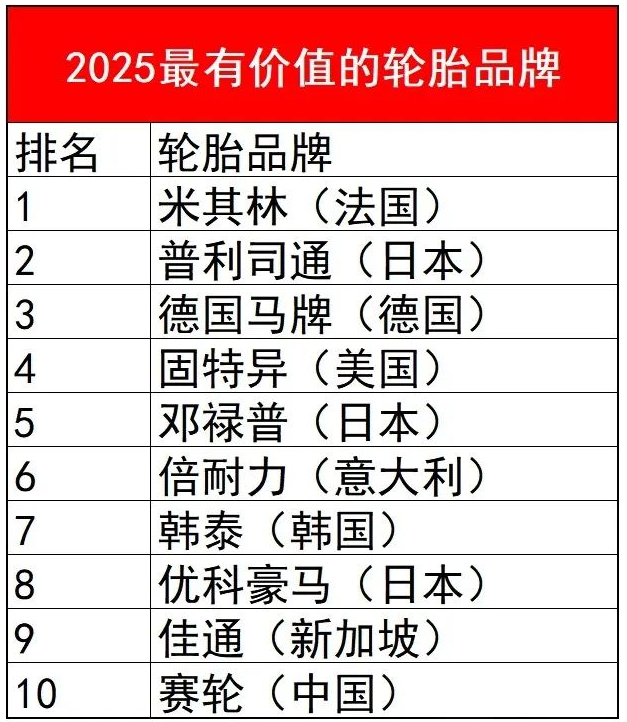 近日,國外媒體發(fā)布了《2025年全球輪胎品牌價值與實力排行榜》在新能源汽車普及加速、綠色技術迭代的產業(yè)背景下,這份榜單不僅揭示了行業(yè)格局的深刻變化,更展現(xiàn)了中國品牌的突破性成長。