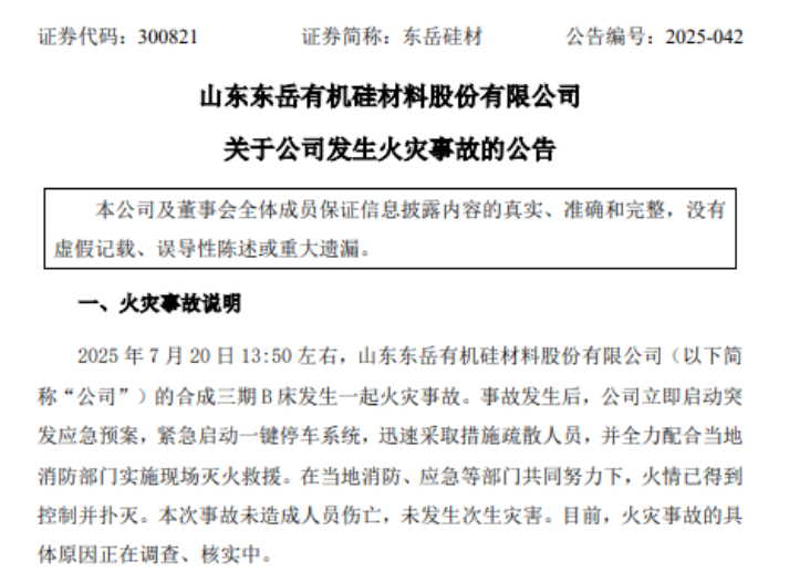 公告明確指出,事故未造成人員傷亡,也未引發次生災害,但合成三期的廠房、設備及部分存貨遭受不同程度損毀。目前具體損失金額仍在統計評估中,由于公司已為相關資產投保,已向保險公司報案啟動理賠程序。不過,該車間恢復生產的時間尚未確定,這一情況可能對企業后續運營產生影響。有機硅單體生產涉及多種化學物質,安全生產要求極高,此次事件也再次引發了對化工企業安全管理的討論。