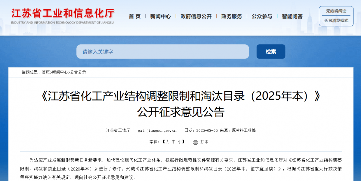 【炭黑產業網】8月7日消息,8月5日,江蘇省工業和信息化廳發布《江蘇省化工產業結構調整限制和淘汰目錄(2025年本)》公開征求意見公告,其中: